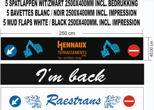 Prijs voor 5 spatlappen2500x400mm. met bedrukking (afname min.5 stuks) Machinale bedrukking in RAL kleuren. Gelieve tekst en RALkleur op te geven voor de bedrukking Ontwerpen bezorgen enkel in volgende digitale formaten : EPS / AI / CDR / PDF Leveringstermijn : +- 4 weken na betaling Een voorontwerp wordt opgemaakt ter controle en goedkeuring.