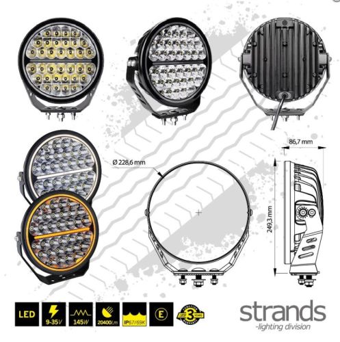 Type of lamp LED Type of LED Osram PCS LED?s 34 Voltage (V DC) 9-32V DC Theoretical effect (w) 12V 170 Theoretical effect (w) 24V 170 Consumption (w) 12V 145.3 Consumption (w) 24V 144.6 Theoretical lumen 20400 Actual lumen 13377 1 LUX @ m 465 Kelvin 6000 IP-class 67/69K Colour housing Black Colour lens Clear Colour LED?s White and Amber Beam pattern Flood Position light Yes. amber and white Connection DT-4 Cable length (mm) 500 Material bracket Stainless steel Material housing/chassi Aluminium Material lens Polycarbonate Length (mm) 228.6 Depth (mm) 86.7 Height (mm) 228.6 Height including bracket (mm) 249.3 Diameter (mm) 228.6 Operating temperature -20?C ? +45?C E-approved Yes According to regulation ECE R112. R7 Reference number 30 EMC ECE R10