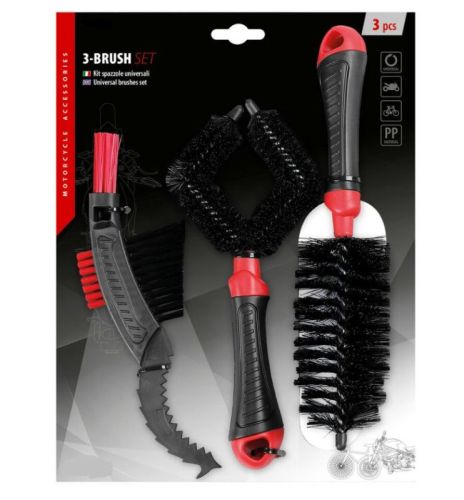 "? Universele borstelset - 3 stuks ? Lange borstel om alle moeilijk bereikbare delen te reinigen. Antislip handvat. Krasbestendige rubberen punt ? Klauwborstel om hardnekkig vuil te verwijderen. Specifiek voor het reinigen van tandwielen, tandwielen, tandwielen en kettingbladen. Ook ideaal voor kettingreiniging. ? Gevorkte borstel. Ideaal voor de spaken van het wiel en blokremmen. Krasbestendige rubberen punt"