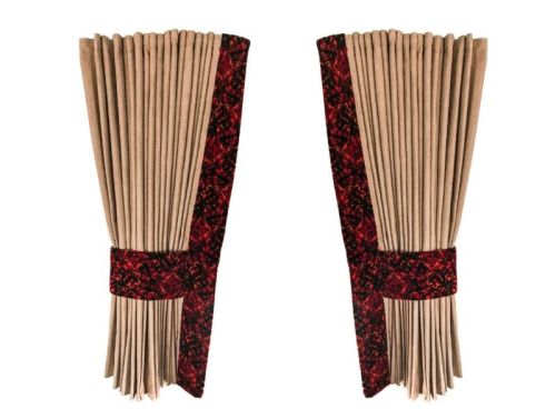 ? BEIGE gordijnen ? Afgewerkt met RODE Deense pluche band ? Hoogte 2x 90cm ? Lengte 2x 260cm ? 2 gordijnhouders in RODE Deense pluche ? Haken om gordijnen op te hangen NIET inbegrepen